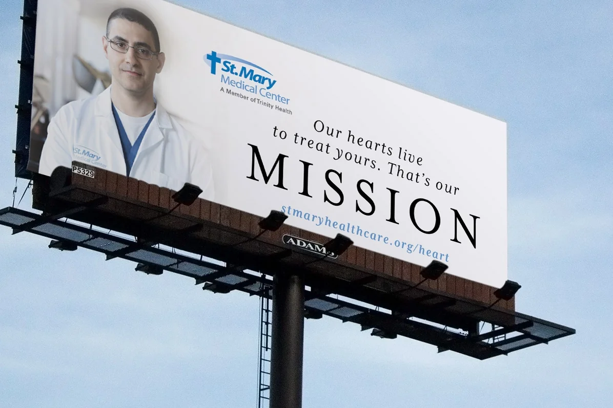 Deliverables: billboard for placement on the US-276 Turnpike, Facebook cover images for the St. Mary Medical Center Facebook page, elevator wraps for the St. Mary Medical Center Franciscan Building & “Mission” campaign branded notecards for St. Mary Medical Center CEO